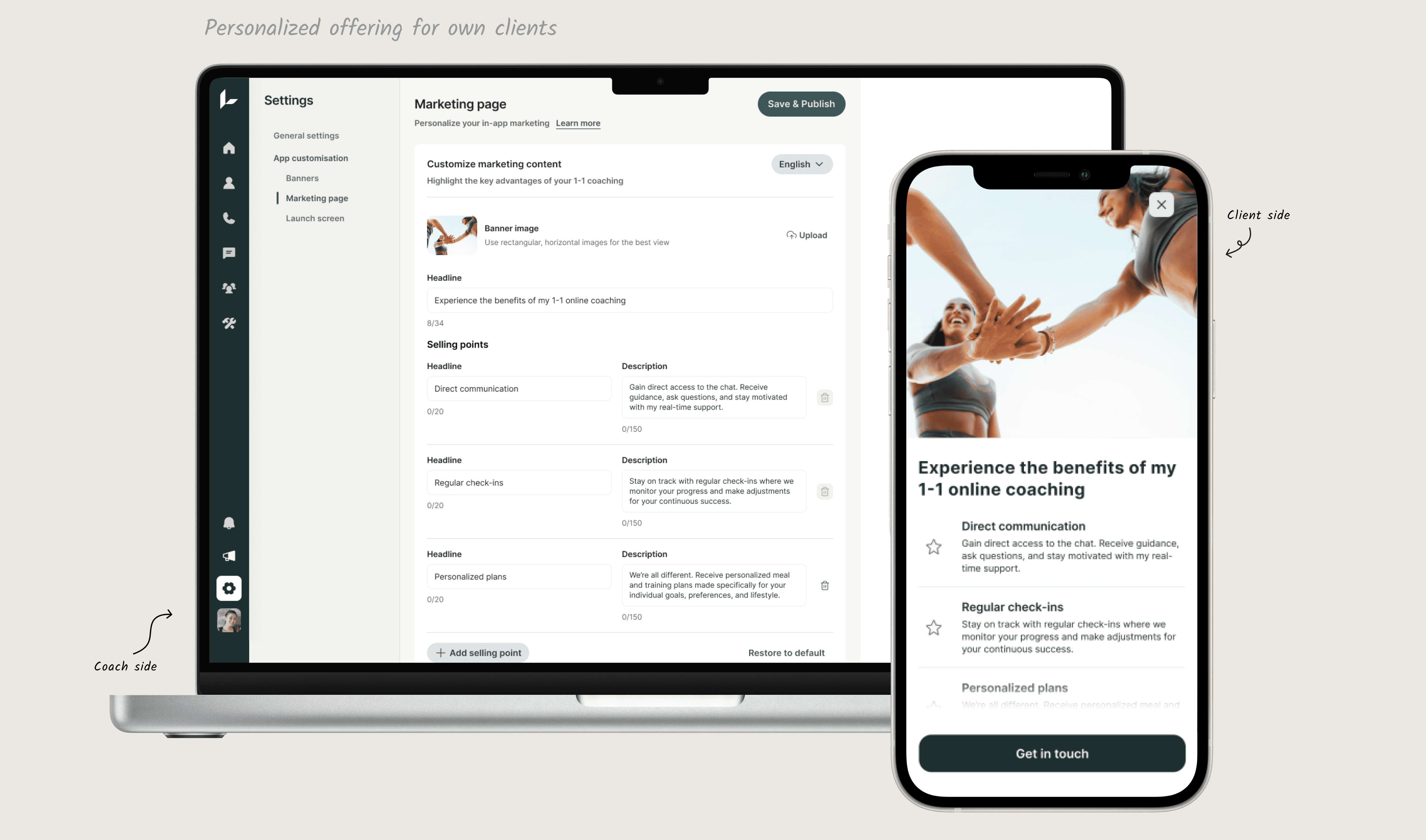 - Personalized Marketing page- solution that helps coaches to tailor their marketing offerings based on their unique product positioning.