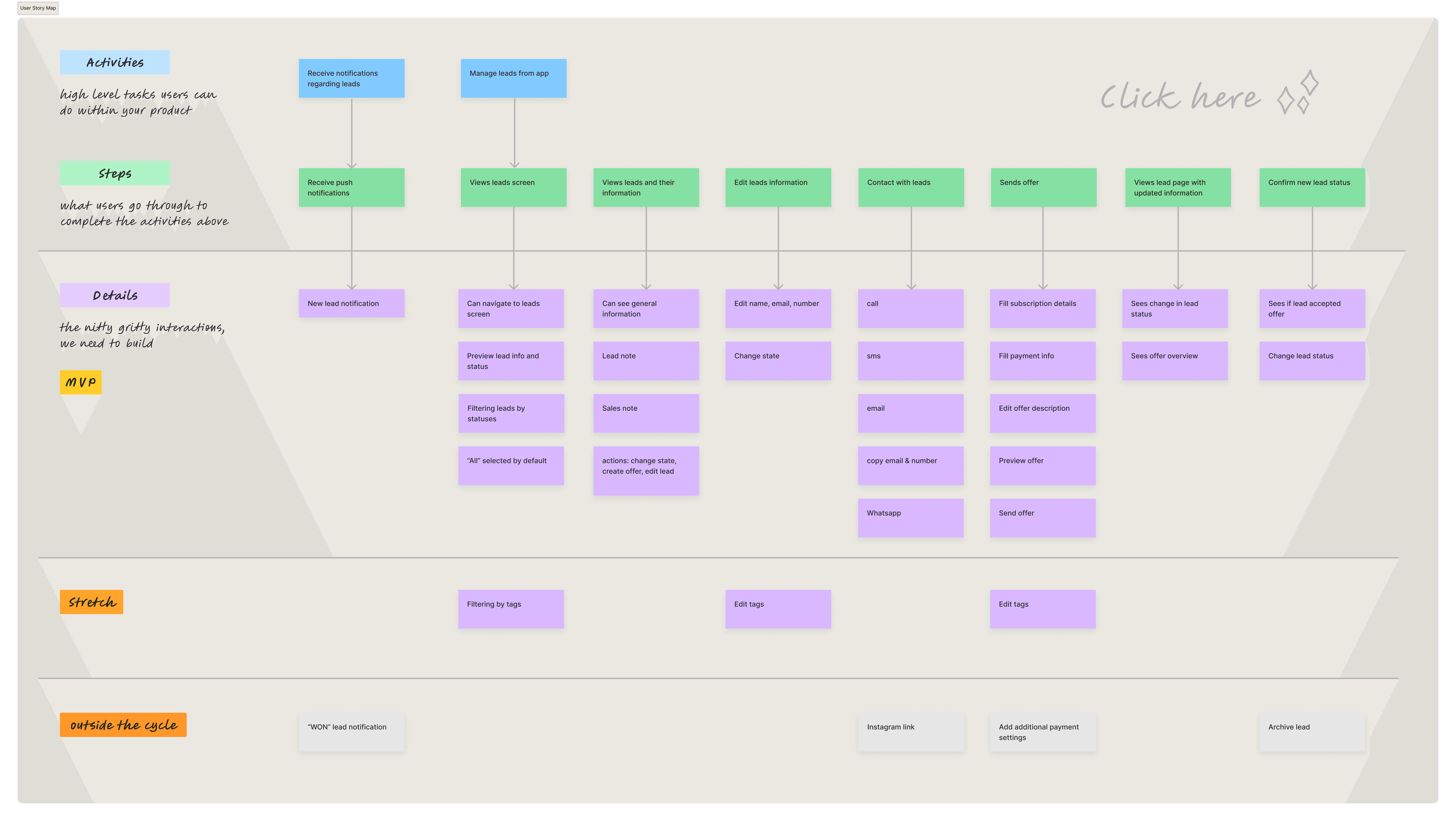 After gathering feedback from the initial wireframe testing, together with team we created a user story map and agree on the product MVP.